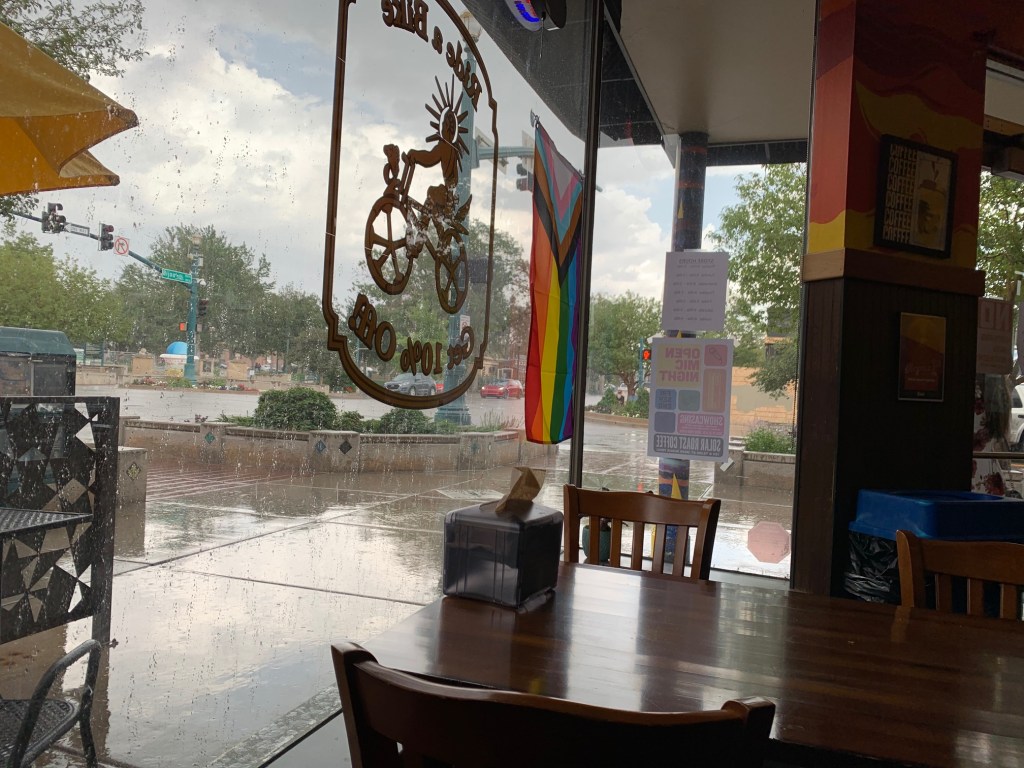 Solar Roast Coffee is a hip little café in downtown Colorado Springs offering a variety of coffee drinks, beans, and classic vinyl records. It’s a very colorful space decorated with an eclectic theme of fruits, origami, and their own vinyl themes for their roasts mounted on the walls. They also have a small assortment of food ranging from cinnamon rolls to chicken and carnitas burritos. While the café itself isn’t expansive, it seemed like a comfortable space to work. Another patron was plugged in and dutifully typing away at a corner table. The café provided a nice relaxing spot to enjoy my coffee while a short rain shower soaked downtown Colorado Springs.